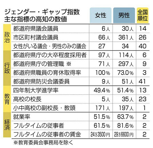 高知県は経済分野で連年の1位、政治分野は男女格差が大きく、連年の35位、行政は連年の9位、教育は前年から一つ下げて4位となっています。