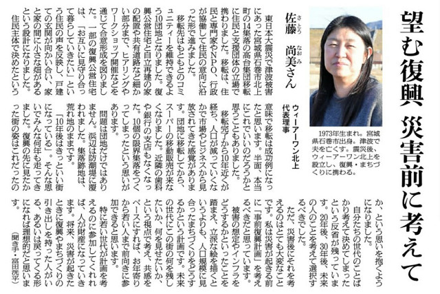 また、今朝の朝日新聞11面の耕論「次にどう備える」では、石巻市北上地区で高台集団移転にかかわられた佐藤尚美さんが「望む復興 災害前に考えて」と語られています。