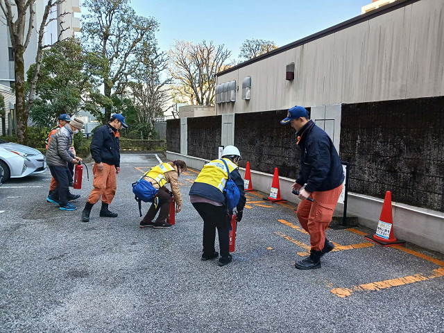 その後は、第二部で消防通報・初期消火・水消火器使用訓練を行い、6階の部屋から出火した想定で行い、同階の方二人が消火器を持って駆けつけ消火に当たる行動をとり、参加者は全員で水消火器の使用体験を行いました。