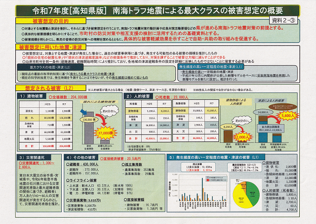 05年2月定例会で、南海トラフ地震対策条例を制定に向けた議論の中で、「条例化する際には、是非、高知県らしさを盛り込んだ条例としていただくことを要望しておきたい。例えば『揺れと津波への予防と避難と復興までを見通す』『行政の責任と地域の支え合いと県民・事業所の自覚と努力の連携』『防災産業の育成』『高齢県という状況の中で要援護者への支援』『日頃の台風災害予防との連携』など課題は多くある」と「災害復興」への視点を県の防災対行政の中に位置づけることを指摘してきました。
