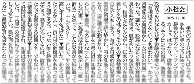 「驚いた。あえてはったりをかまし、市町村の危機感をあおったように聞こえる。いったい誰と勝負しているのだろう。発言の先にいるのは、政界のくせ者たちでも暴走する投機マネーでもない。ともに苦楽を重ねる県民だ。」とありました。