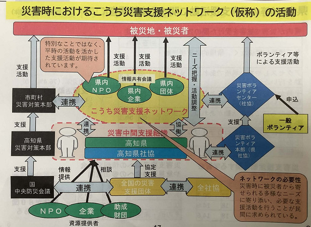 そのような中で、昨日、平時及び災害時において、相互が連携・協力することにより、NPO等の支援団体による被災者支援活動が円滑かつ効果的に行われ、被災者の避難生活等への支援と早期の生活再建及び被災地の復旧・復興に寄与することを目的に、高知県社会福祉協議会、全国災害ボランティア支援団体ネットワーク(JVOAD)及び高知県の三者で、「災害中間支援組織の設置及び運営等に関する協定」が締結されました。